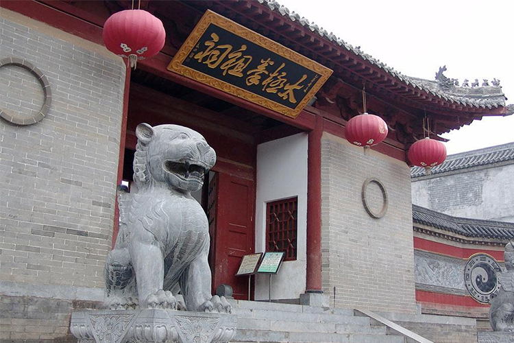 太极拳祖祠山门建筑别致,面阔三间。大门正中上方,镶嵌一块匾额,上书五个斗大金字:“太极拳祖祠”。山门两侧的“八”字墙壁上,分别雕绘“河图”、“洛书”和“伏羲太极图”,它们演绎着太极图说与太极拳理之间极其密切的内在关系。山门前,一对雕刻精细、形象逼真的石虎雄踞两侧。