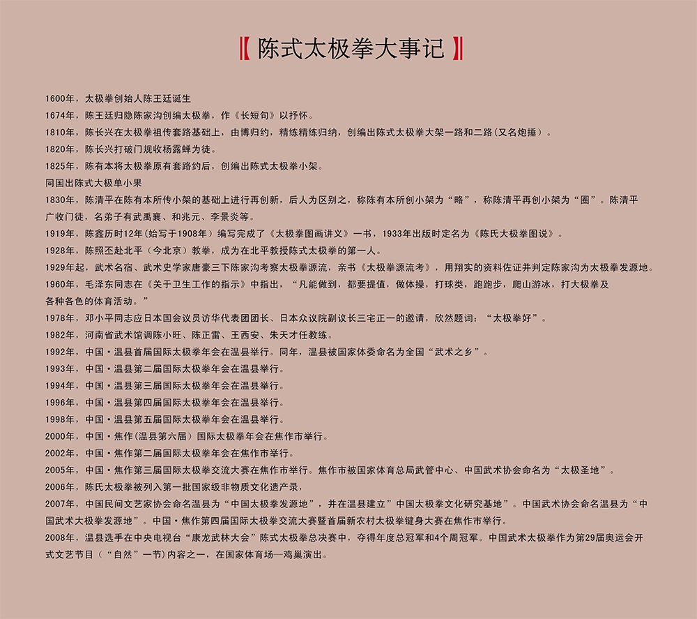 简介:陈王廷(1600—1680),字奏庭,太极拳创始人。自明洪武初年,陈姓由山西洪洞县迁至常阳村(即今陈家沟)时算起,为陈家沟陈氏第九世。祖、父均为明朝官吏。弟兄四人,该居其二,他天资聪慧,勤奋好学,不但深得家功精髓,于武功一道出类拔萃,而且熟读诸子百家,涉猎经 史古籍,学识渊博,以致“文事武备,皆卓越于时”。年轻时曾走镖山东一带,声播齐鲁。惜生不逢时,无法抒发报国之志,明末仅为县乡兵守备。清初。社会动荡不安,他遂隐居乡间, 终日以《黄庭经》为伴。晚年立志创拳,以遗后世。于是,倾心搜集、整理民间武术,较其同异,加以继承和创新。在此基础上,据《河图》、《洛书》之太极阴阳学说,与导引、吐纳及中医经络学说相结合,融诸家之长于一炉,创编出一种阴阳开合、虚实转换、刚柔相济、快慢相间、老少咸宜的拳术,这种新拳术,据太极之理,由无极至太极,由无相而生有相,由静而生动、每个招式均分阴阳(即虚、实、柔、刚),动作又以弧形、曲线为基础、共分太极拳五路、炮捶一路、一百单八式长拳、双人推手等,又据此理, 创编了刀、枪、剑、棍、锏、双人粘枪等器械套路,这些拳、械套路,便是当今风靡世界之太极拳之源,陈王廷也因此而名播寰。