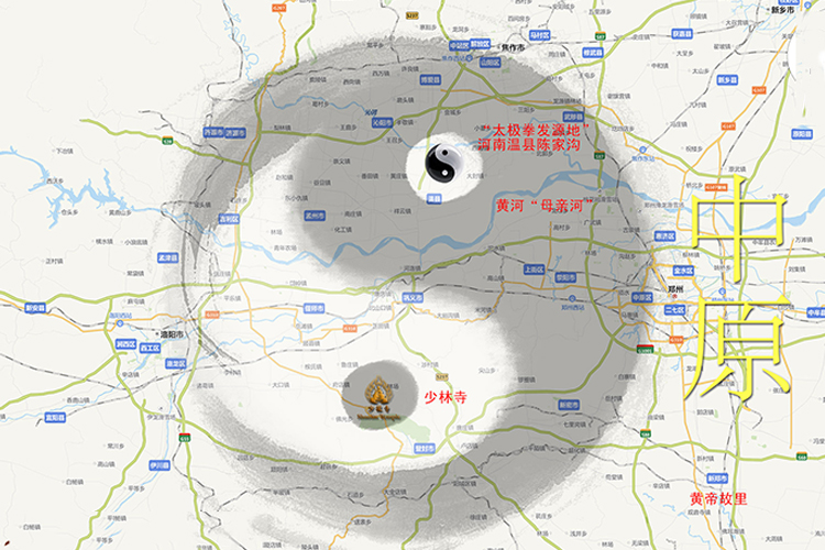 世人称太极拳为内家拳,而外家拳著称于世的“少林寺”则座落于黄河之南的河南省郑州市嵩山五乳峰下。少林寺是世界著名的佛教寺院,是汉传佛教的禅宗祖庭,在中国佛教史上占有重要地位,被誉为“天下第一名刹”。因其历代少林武僧潜心研创和不断发展的少林功夫而名扬天下。大河南北的这种如“太极阴阳鱼”般的奇妙对称,似乎有着别样传奇色彩。